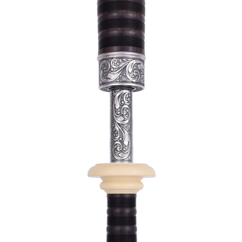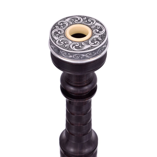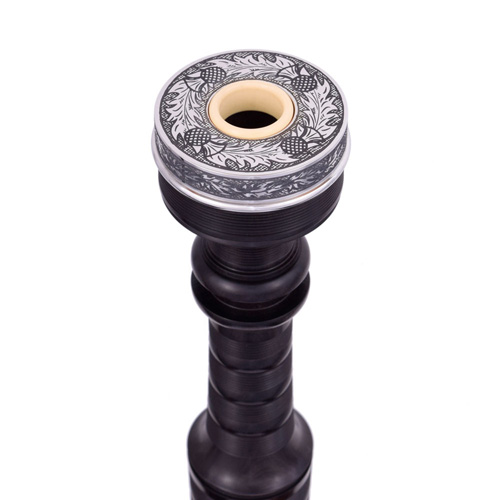 Engraved nickel ring caps, ferrules, slides and mouthpiece slide. The depth of engraving is what sets these bagpipes apart from other manufacturers. “The look of a half silver set for half the price”