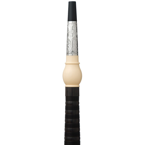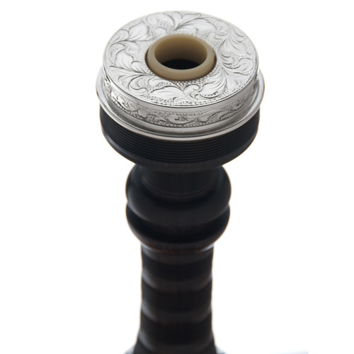 Hand engraved Sterling silver ring caps, ferrules, slides and mouthpiece slide with Imitation Ivory projecting mounts, hemp retainers and ring cap bushes.